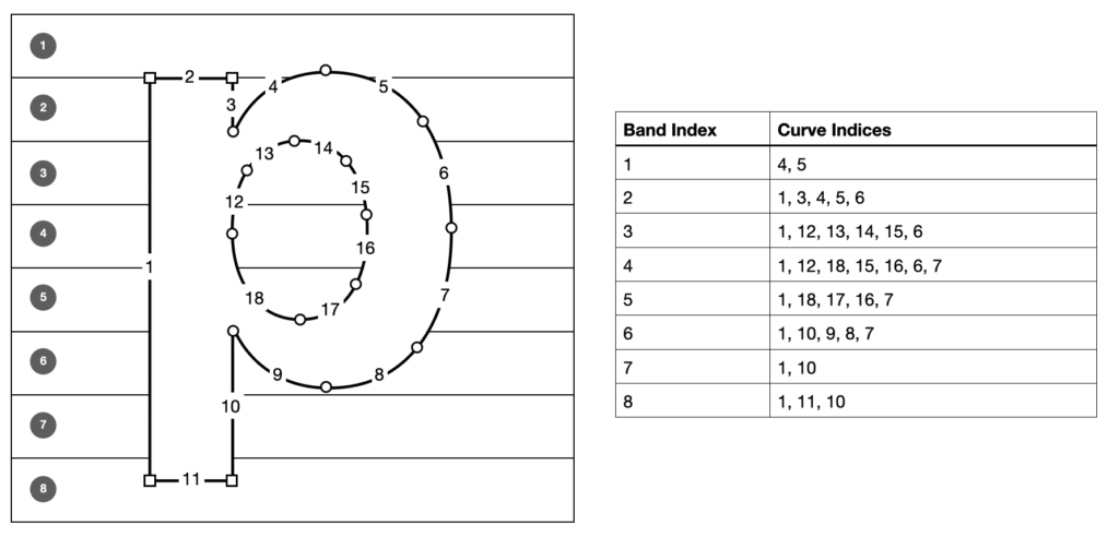 As a preprocessing step, curve segments are allocated to one or more “bands;” slices of the glyph that subdivide it into a handful of rectangular regions.