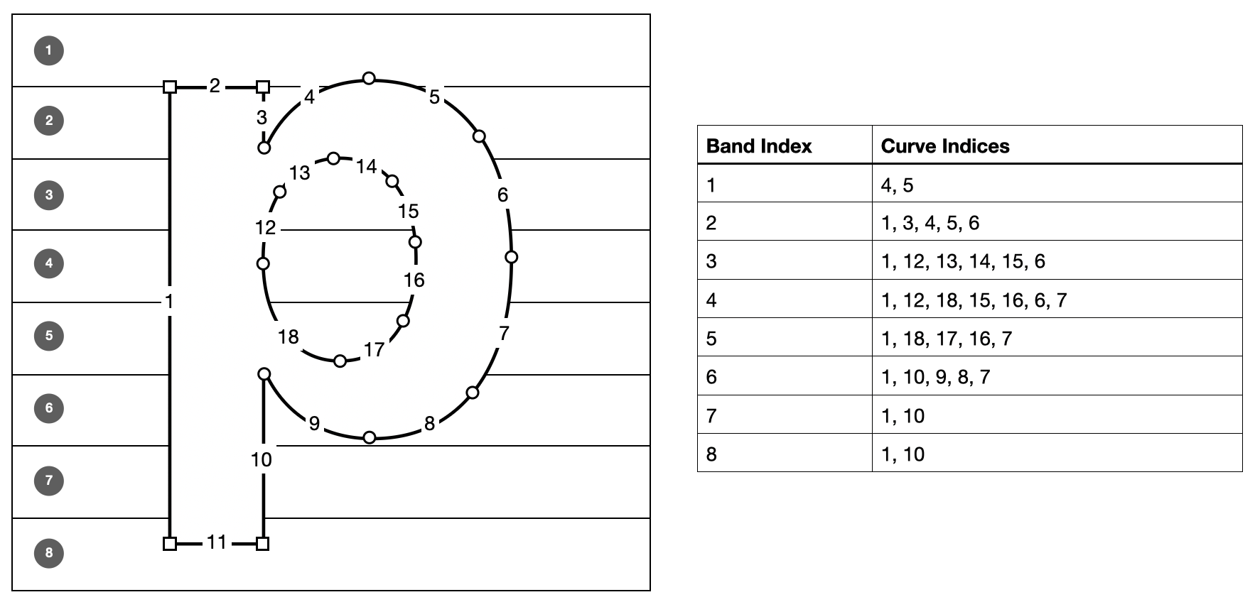 As a preprocessing step, curve segments are allocated to one or more bands, slices of the glyph that subdivide it into a handful of rectangular regions.